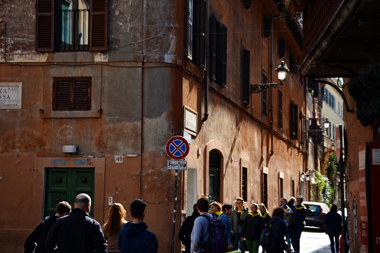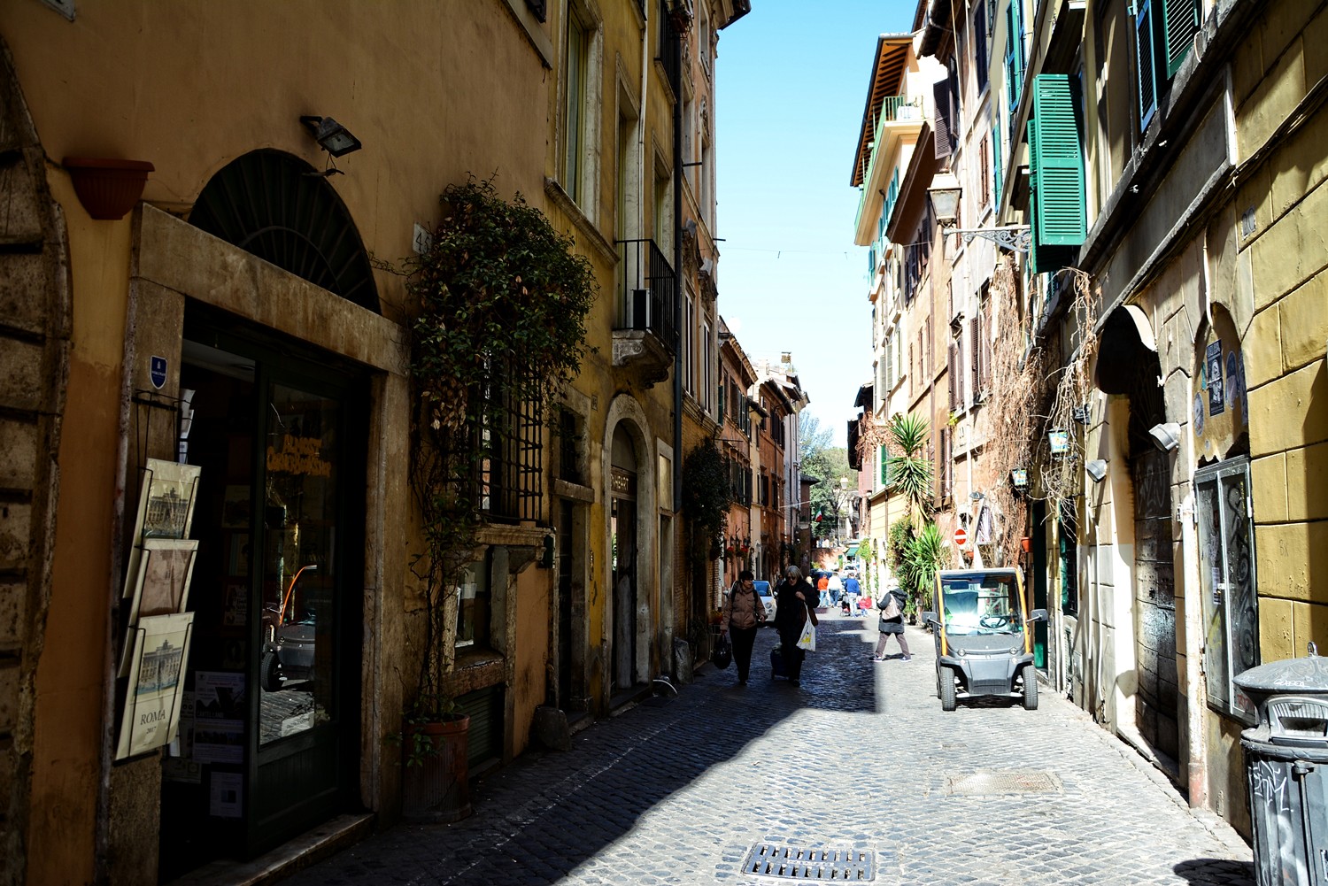 Aby nie znienawidzić Rzymu i jego pełnych turystów uliczek, postanowiliśmy kolejny dzień poświęcić na wycieczkę rowerową. Sprawdzić miejsca, w których skryli się przed nami mieszkańcy Wiecznego Miasta. Swoją wyprawę rozpoczęliśmy na Zatybrzu, które w ciągu dnia przyciąga do siebie dużo mniej turystów niż okolice Panteonu i Koloseum, co jednocześnie nie zmienia faktu, że dysponuje ono doskonałą bazą noclegową, barową a nawet rzemieślniczą. Wieczorem, kiedy mieszkający w tych okolicach turyści wrócą z obchodu po wszystkich egipskich obeliskach, a lokalni mieszkańcy wrócą z pracy i kościoła, uliczki te zaludnią się wesołym tłumem. Jeśli szukacie miejsca na wieczorne piwo – skierujcie się na Via Benedetta albo skuście się na przystawkowe all you can eat w Vicollo del cinque – 10 euro za nieograniczone dokładki smacznych przekąsek i jedną kolejkę dowolnego alkoholu. Jeśli macie ochotę zgubić się wśród pięknych przedmiotów, zajrzyjcie do Polvere del Tempo (tłum. Pył Czasu), w którym znajdziecie przeróżne zegary, globusy, mapy, notatniki, kompasy i inne mniej lub bardziej przydatne urządzenia.